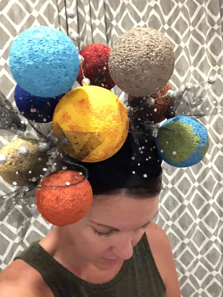 I used heavy wool felt shaped and stitched to a headband as a base. Different sized styrofoam balls were painted with acrylic paints to make the planets. I cut the bottom off the sun so there was a flat portion to glue securely to the felt to create the center of the solar system headpiece. All the other planets were attached to the sun with pieces of wire and then more wire was used to connect each planet to the one next to it until it was balanced and sturdy. The black tulle ribbon worked perfectly to tie around the wire to hide it and added a bit of starry night sky in the background. A barrette on one side and large bobby pin on the other held it securely enough to move my head freely without it falling off. Success!!