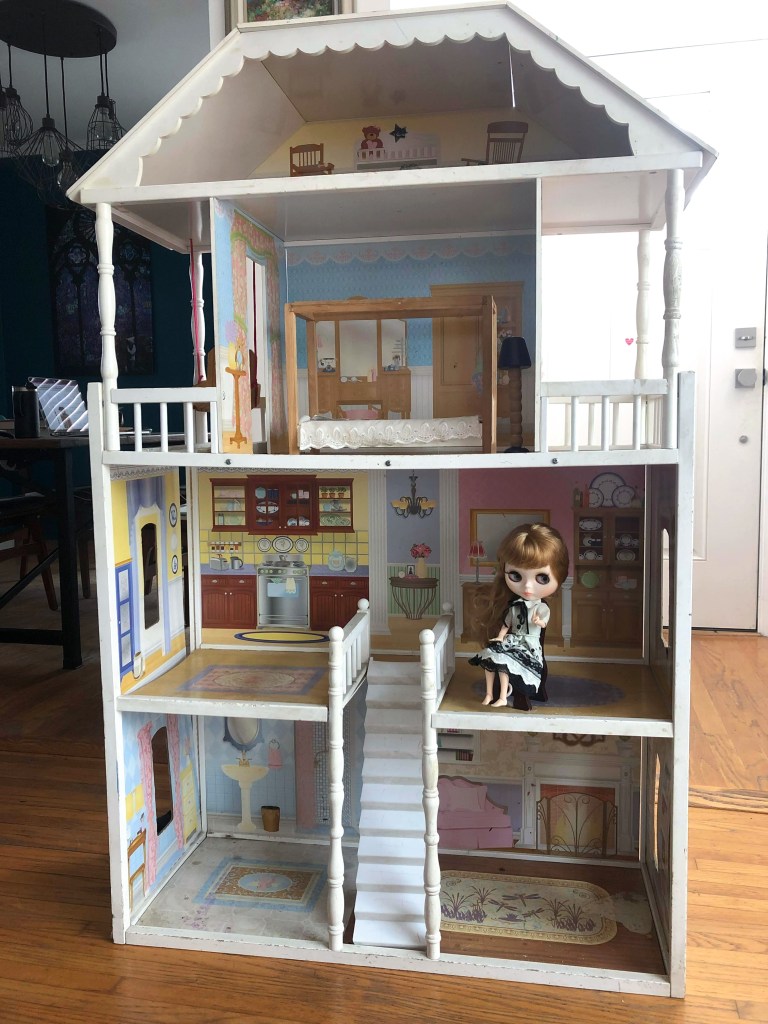 Earlier this summer on my drive home one day, I spotted this enormous dollhouse in the driveway at a neighbors garage sale. Customizing a dollhouse is something I’ve always dreamed of doing and on this day with this house it felt like it was time! I snapped this before picture with Blythe inside for scale. It’s the 1/6th scale Kidkraft Savannah Dollhouse which retails for over $200 and appears to fetch a good chunk of change even secondhand. My price tag? $10
