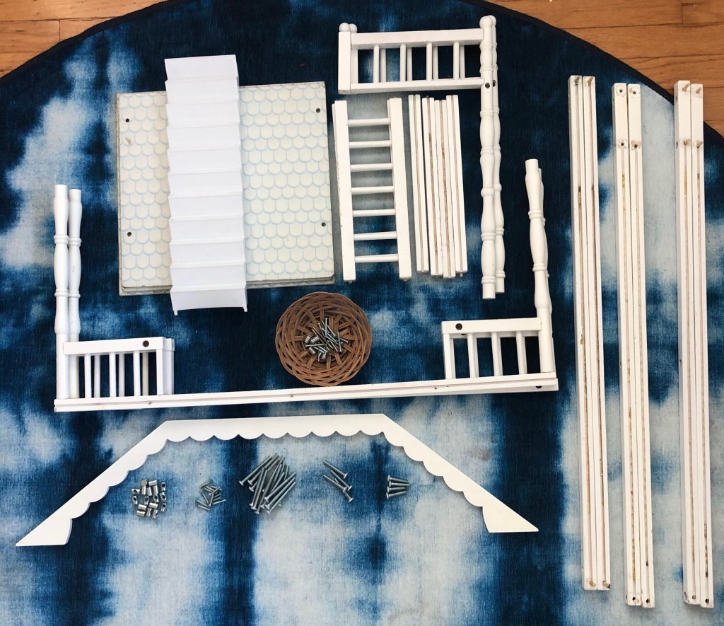 There were definitely some issues with this dollhouse. It was filthy and appeared to have been taken apart and rebuilt incorrectly so it was rickety and the walls and floors weren’t staying in place. For $10 I took a chance on it with hopes I could take it apart, clean and refinish the pieces and find instructions online to rebuild it in all it’s original glory. And that I did.