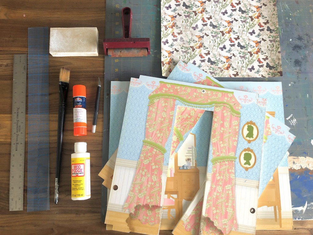I thought it made sense to design the interior and update the walls and floors before putting the entire thing back together, but once I got into the project I realized it would be easier to have a blank canvas rebuilt and standing in my art room that I could slowly work on over time, room by room. The image above shows the tools and materials I used to wallpaper one of the rooms with scrapbooking paper.