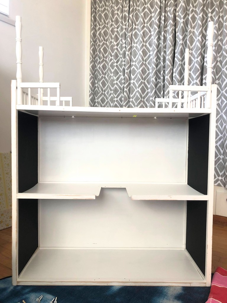 Now for the rebuild and the one issue I ran into. When I took the dollhouse apart, I mistakenly pulled apart pieces that originally came assembled when it was brand new. In the picture above, you’ll see the walls inside those pieces are black. Once the original side walls were repainted, they wouldn’t fit back into the grooves securely so when it came time to build the dollhouse they both fell apart. I went back to the craft store and purchased similar board to replace the side walls, but they only had the correct weight and thickness in black. I actually like the black wall for now and can always modify it as I continue to work on it room by room.